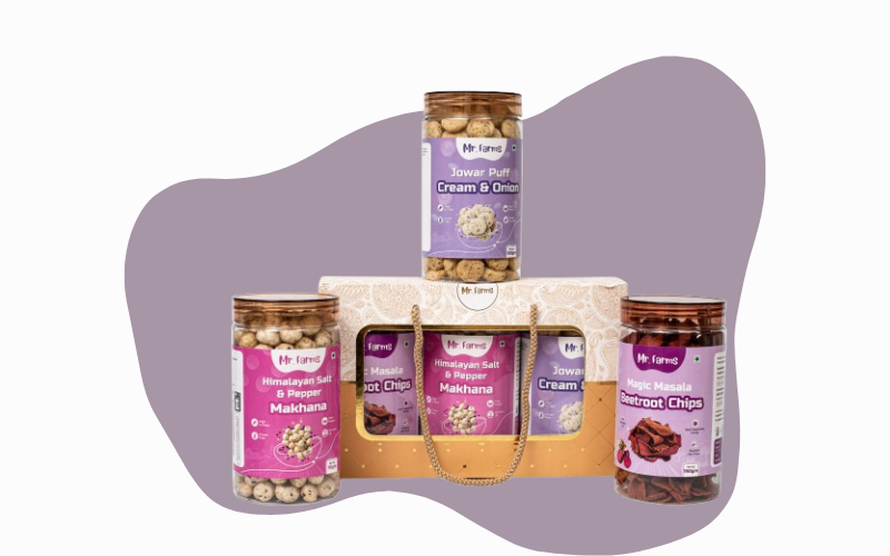 Mr. Farms Combo Pack of 4 – Pudina Makhana, Cream & Onion Makhana, Jowar Puffs, and Beetroot Chips