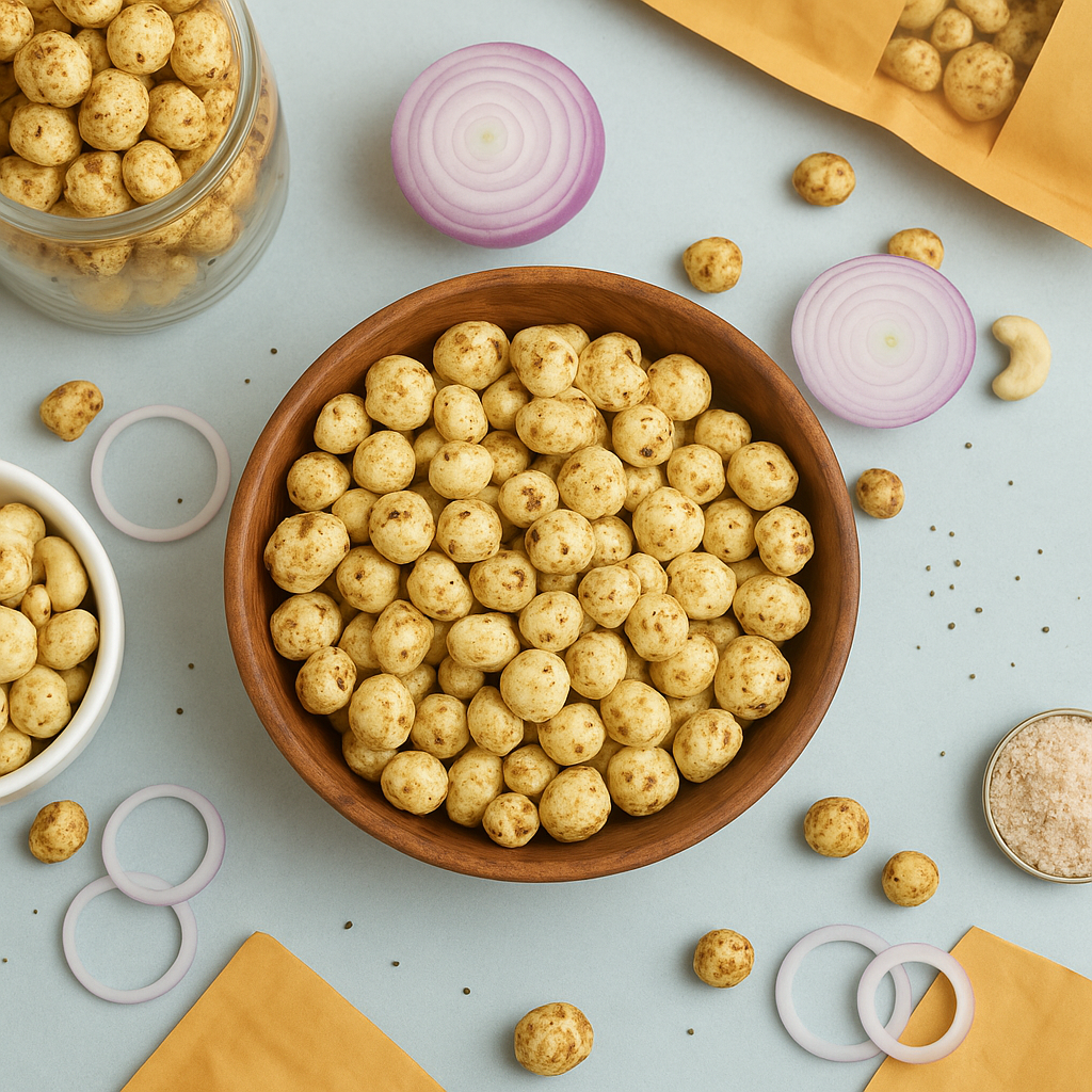 Delight your taste buds with the perfect fusion of light, crunchy makhana (fox nuts) and the irresistible tang of cream & onion seasoning. Every bite is a burst of creamy richness balanced with a savory onion twist, making it a snack you just can’t put down.