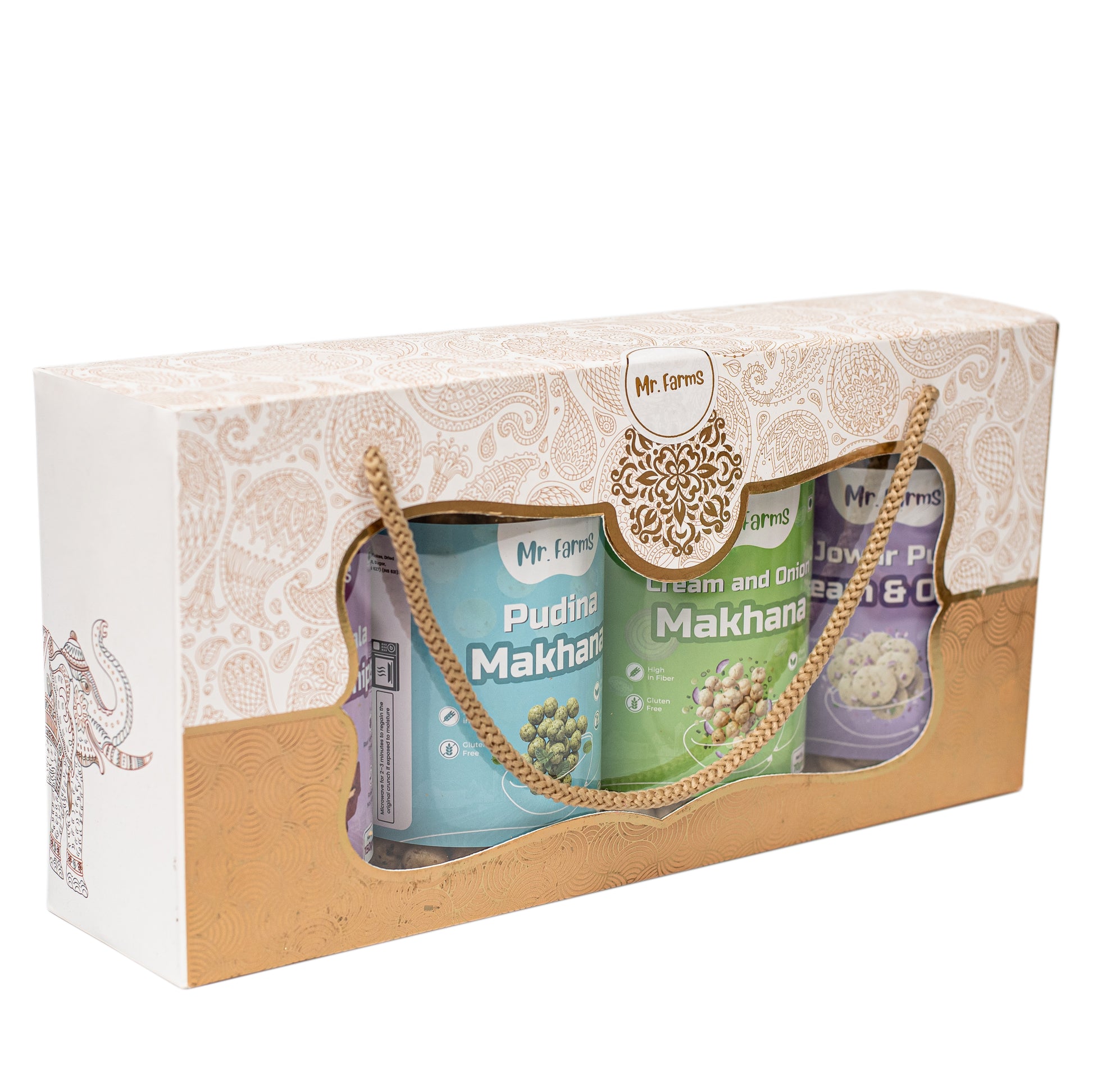 Mr. Farms Combo Pack of 4 – Pudina Makhana, Cream & Onion Makhana, Jowar Puffs, and Beetroot Chips
